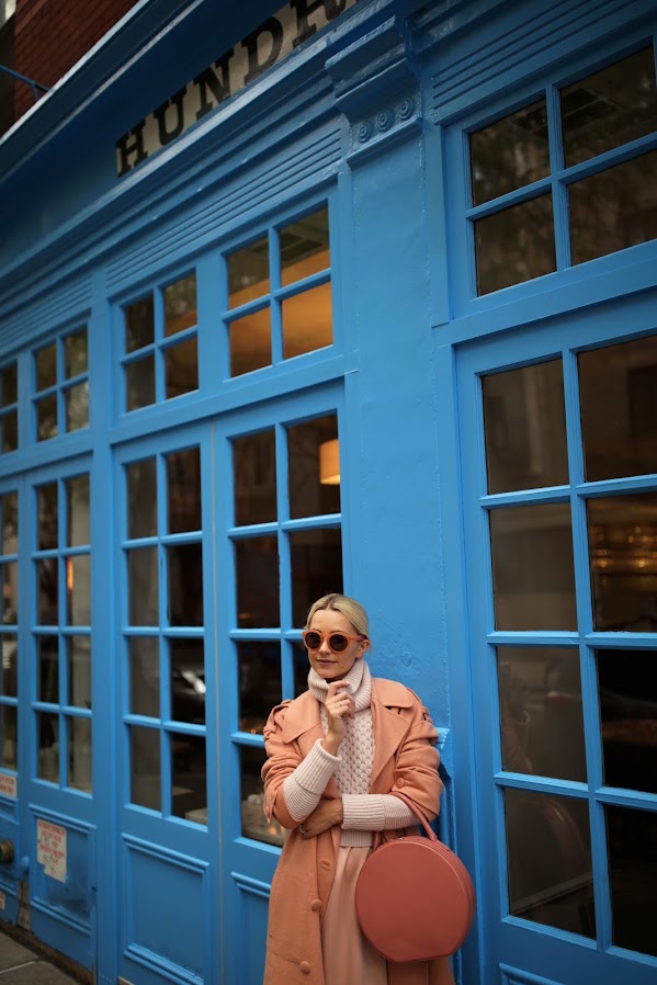 Coat: Tibi (also here). Slip Dress (under $50). Shoes: Club Monaco. Bag: Mansur Gavriel. Sunglasses: Old, similar. Sweater: Club Monaco (on sale).